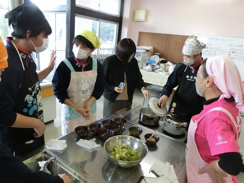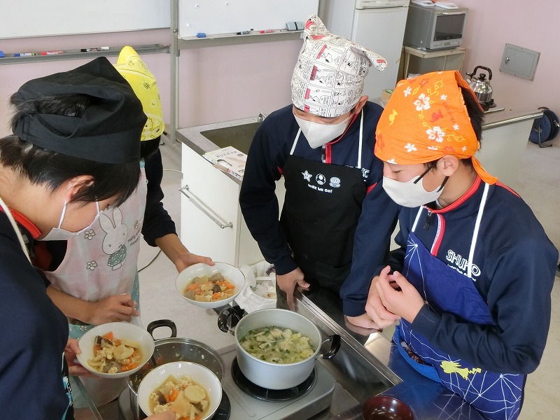 12月16日(火)、2年生の家庭科で調理実習をしました。メニューは郷土料理でけんちょうとチシャなますとつみれ汁でした。今回は、地域の食生活改善推進委員(食推さん)の方がご指導に来てくださり、調理の仕方や地域に伝わる食の知恵を直接伺うことができ、非常に有意義な時間となりました。食のプロである皆様との交流を通じて、食への関心がより一層深まったようです。ご指導ありがとうございました。