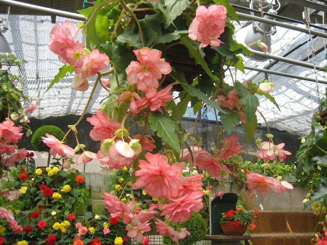 天井から吊り下げられたシャンデリアのようなベゴニアです。花のひとつひとつが、まるで大きなバラの花のようでした。
