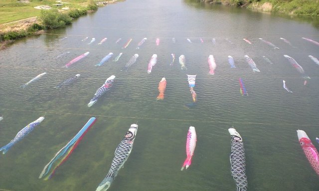 山口県防府市奈美の「水辺の楽校」横の佐波川中央橋下にこいのぼりが泳いでいます。 今年で5回目だそうです。 各家庭で子供さんが大きくなりタンスにしまわれていたこいのぼりを有効利用しましょう、ということからこのイベントが 始まったそうです。 普通は空を泳いでいるのですが、こいは水の中でという原点に帰ったからだそうです。 期間は毎年5月3日から5日までの3日間です。 気持ち良さそうにのびのびと泳いでいました。