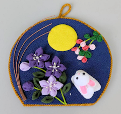 22日(水) 28日(火) 【指導】山田千代美 【内容】小さなお月見の飾り 【持参するもの】布はすべて正方形です 黄色布5cm、飾り土台布30cm 花用布(紫系2色)各10cm2枚、(ピンク系)10cm2枚、葉用緑布10cm1枚 うさぎ用白布10cm1枚、ボンド、つまようじ、筆記用具、ものさし、ハサミ、布バサミ 厚紙、ピンセット、布用カッター(ある人) カッターボード(ある人) ![]() |