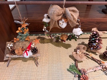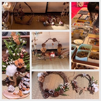 ●綿と自然の素材でものづくり(第5回)クリスマス飾りつくり 最終回の今回はクリスマス飾り作りのワークショップです。綿やキーウィのつる、自然の木の実などの素材をつかって思い思いの作品が出来上がりました。スタッフも一緒に楽しい時間を過ごしました。全5回のものづくり講座に参加していただいた皆さん、ありがとうございました。