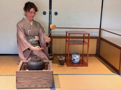 ●お煎茶を楽しむ会 4月28日、日本礼道小笠原流煎茶教室皆様によるお煎茶を気軽に楽しむ会が開催されました。庭のギョリュウの花が満開でお天気にも恵まれた日、多くのお客様に来て頂き、美しいお点前の所作、おいしいお茶とお菓子、会話で楽しい一時を過ごしました。