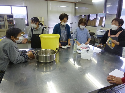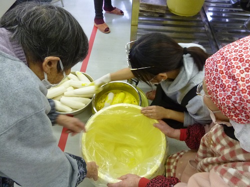 ドリーム弁当販売前試作と漬物教室 ・12月17日 9時から24日販売予定のドリーム弁当の最終試作を交流センター調理室にて行いました。 今回の特別付け合わせのブラウニーケーキを宮原さんの指導を受けながら女性陣が行いました。ブラウニーケーキは 素晴らしい出来栄えでした。 ・12月17日 13時から男性陣2名を交え漬物の指導をして下さる山本さんに教わりながら、沢庵漬けの漬けこみを 行いました。約1時間の作業でで漬けこんだ10kgの沢庵は今後皆様にお披露目する機会があるかもしれません。