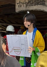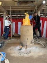 今年も古代の銅製錬実験をおこないました。発掘調査に基づいて、なるべく古代のままに再現された製錬炉を使って、銅鉱石の製錬をおこないました。炉に空気を送り込むフイゴは、まつりに参加された多くの人が踏んでくださいました。また、この実験の様子を美東中学校の生徒の皆さんが、わかりやすく自作のイラスト等を使って説明してくれました。 |
