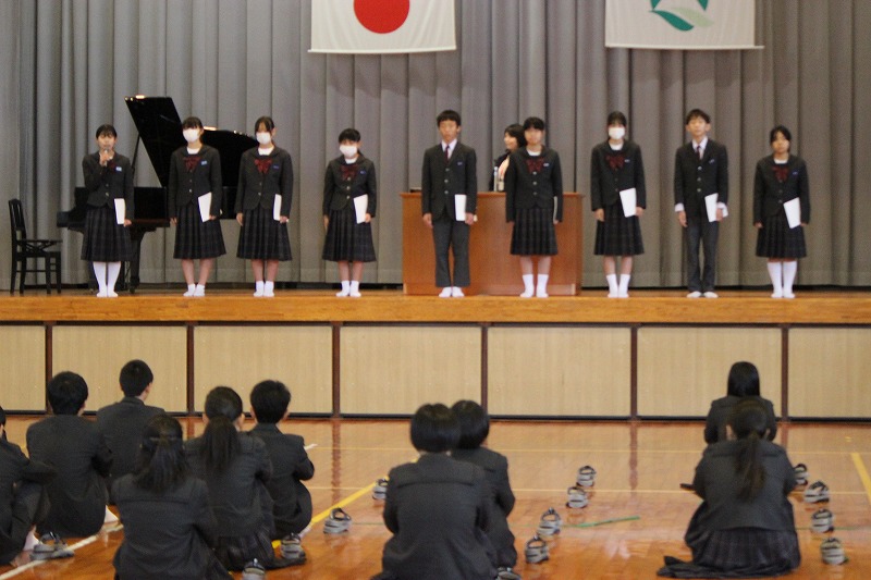 12月24日(水)は2学期の最終日でした。多くの行事が行われた今学期でしたが、一生懸命に取り組んだ生徒達の表情は、達成感に満ちて、また一回り成長したように感じました。人権標語やポスター、交通安全のポスター、さらに美祢市駅伝大会の表彰式も行われました。 生徒会執行部の退任式や任命式も行われ、いよいよ秋芳中も代替わりし、これまでの伝統を引き継ぎつつ、新しい風が吹くのだと期待感でいっぱいになりました。