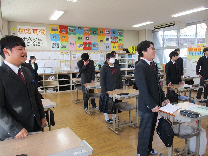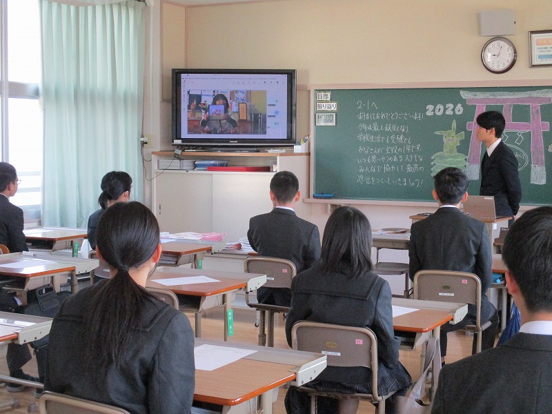 本日、令和8年1月8日(木)は寒気の影響で、気温が非常に低いため、オンラインによる第3学期の始業式を各教室で実施しました。式辞では、午年にちなんで、目標に向かって颯爽と駆け抜け「飛躍」「前進」の年にしていきましょう、また、急激な技術革新が進む現代社会ではありますが、「心の力」を大切にしていきましょうなどと述べました。校歌斉唱では、CDが不調で音が途中で途切れたのですが、生徒たちはアカペラで元気よく歌ってくれました。