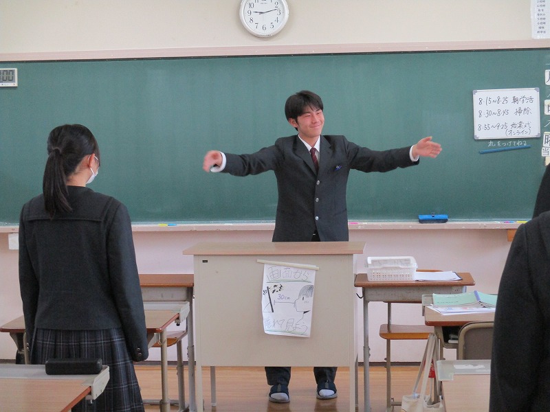 5月12日、美祢市観光協会のお取り計らいで、日本航空のスタッフの方々にお越しいただき、接遇のマナー講座を受講しました。今年度は、職場体験学習に向けて、この時期に講座を開いていただき、一般的なマナーや「笑顔のポイント」、「お辞儀の仕方」などを教えていただきました。2年生にはぜひ、体験学習で成果を発揮してきてほしいです。