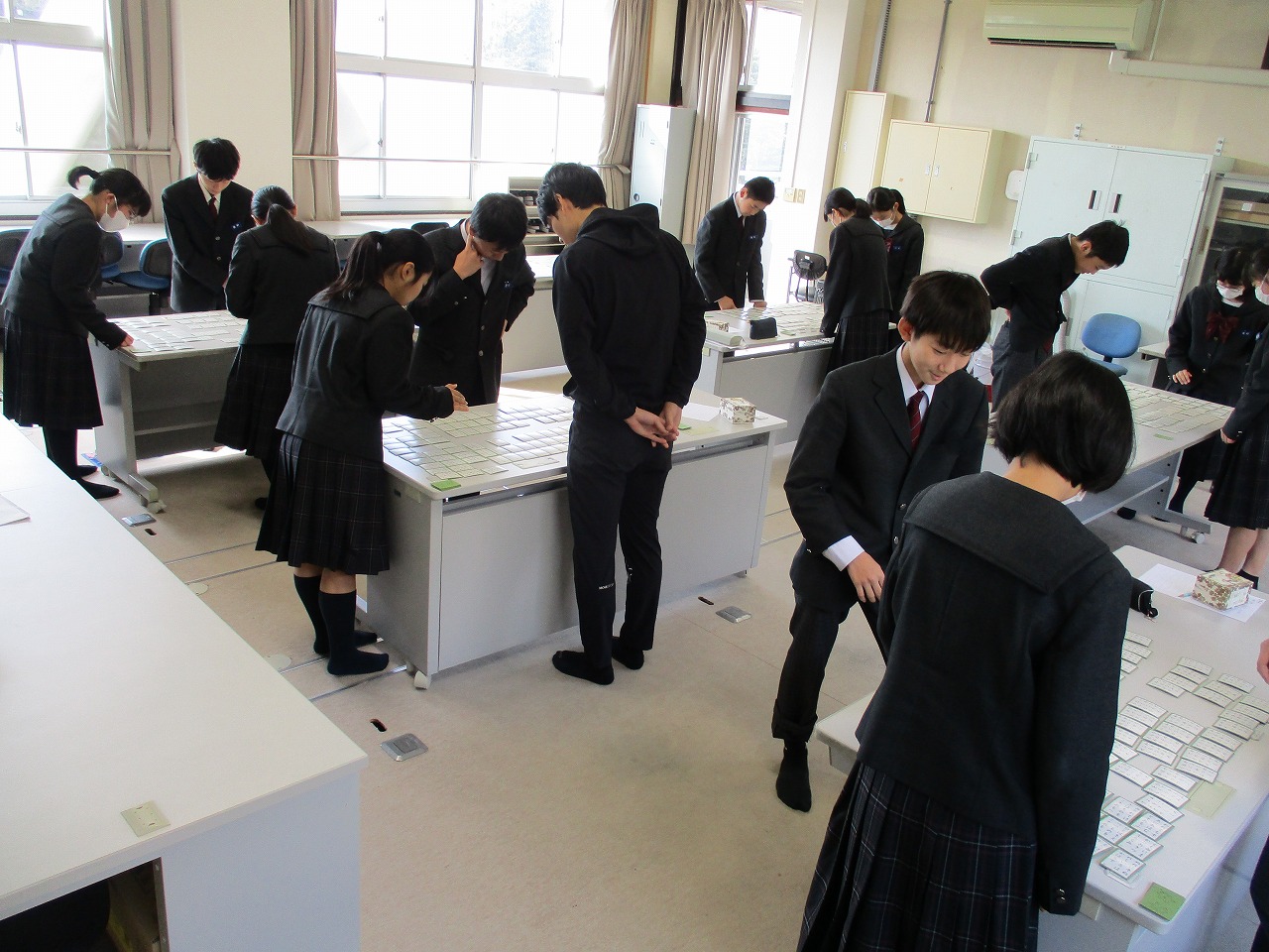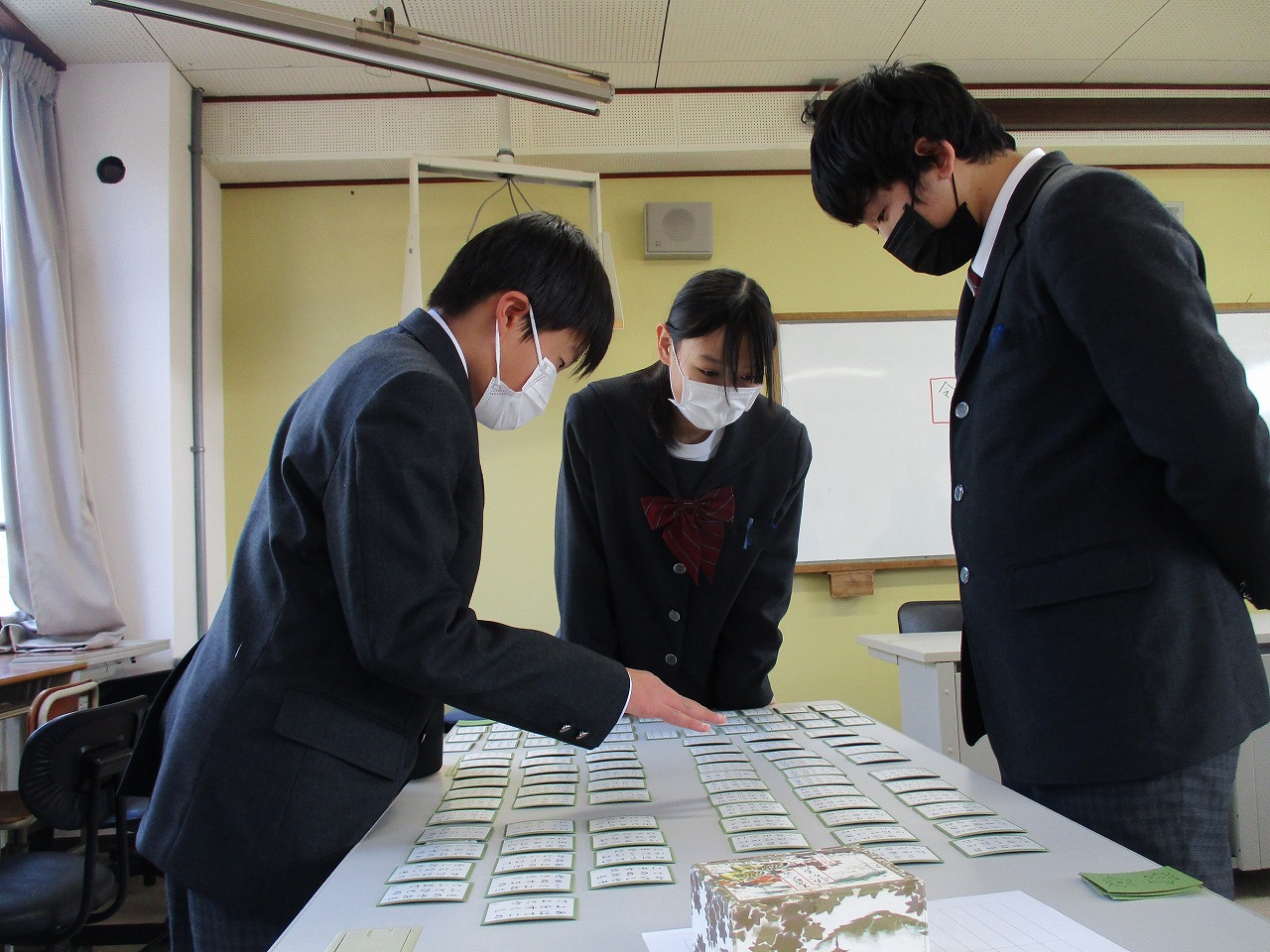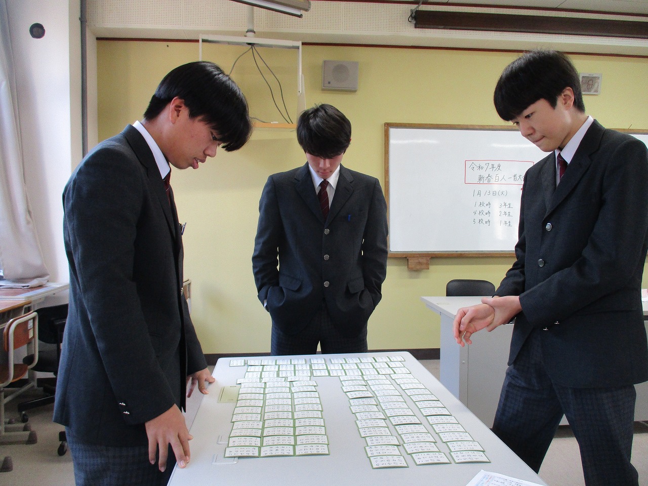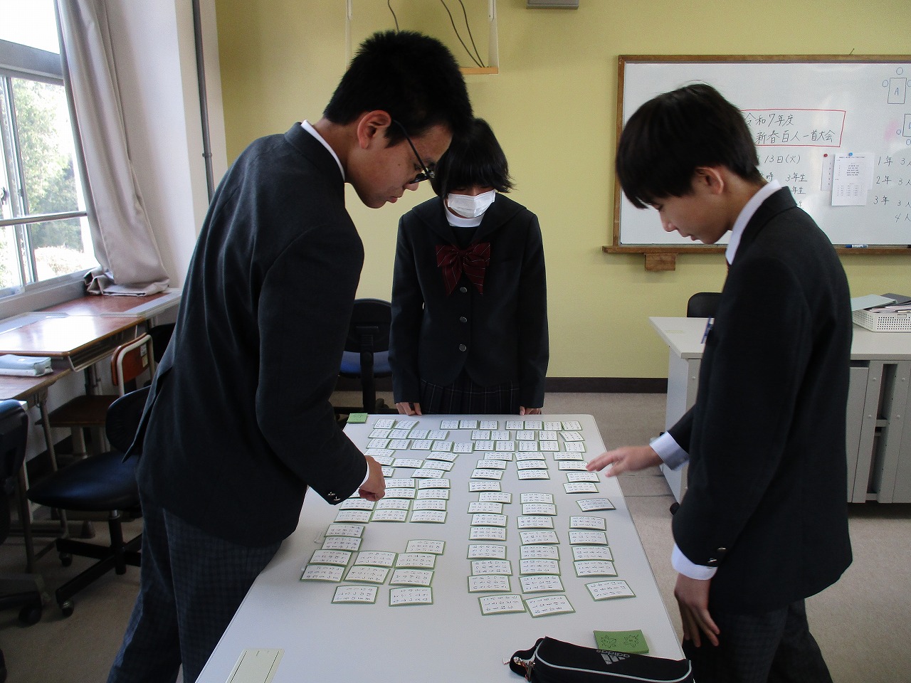 新年最初の行事として、国語科の授業にて、学年別百人一首大会が開催されました。グループで対決した後、成績に応じて次のステージへと進む仕組みになっており、ステージが上がるにつれて、白熱した試合へと展開していきました。日本の伝統文化である百人一首の体験を通じて、楽しみながら級友との親睦を深める貴重な機会となりました。
