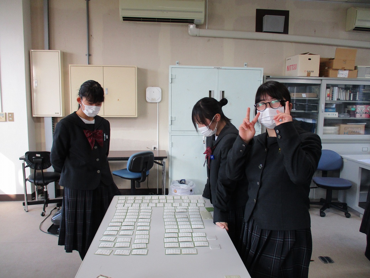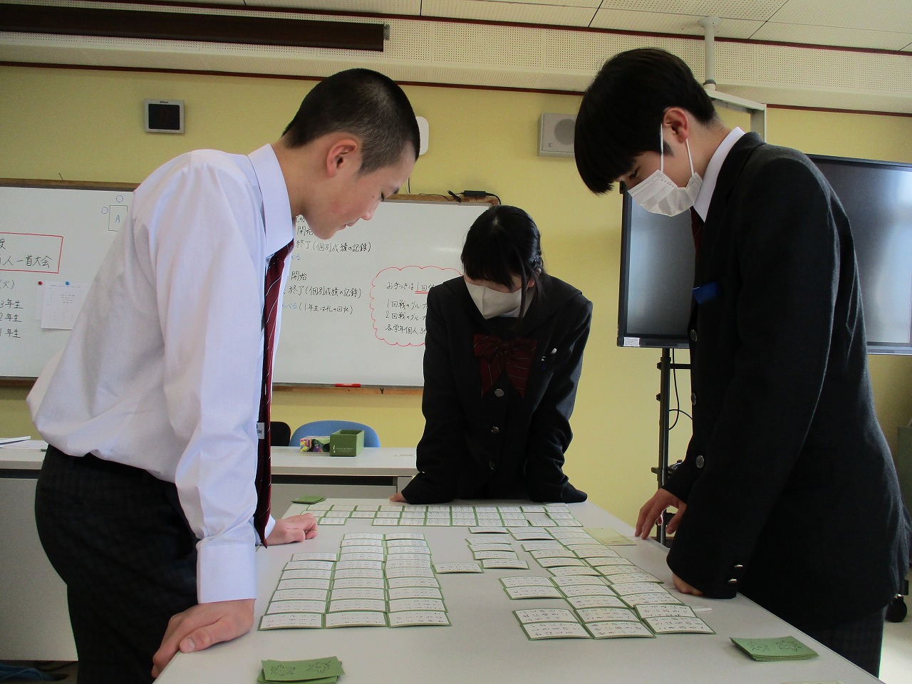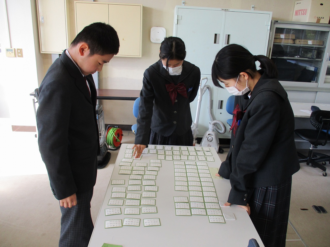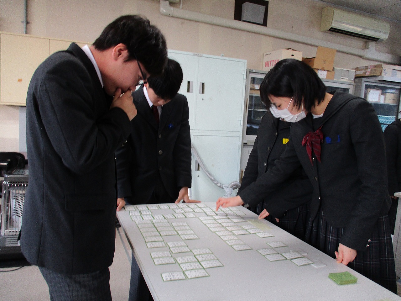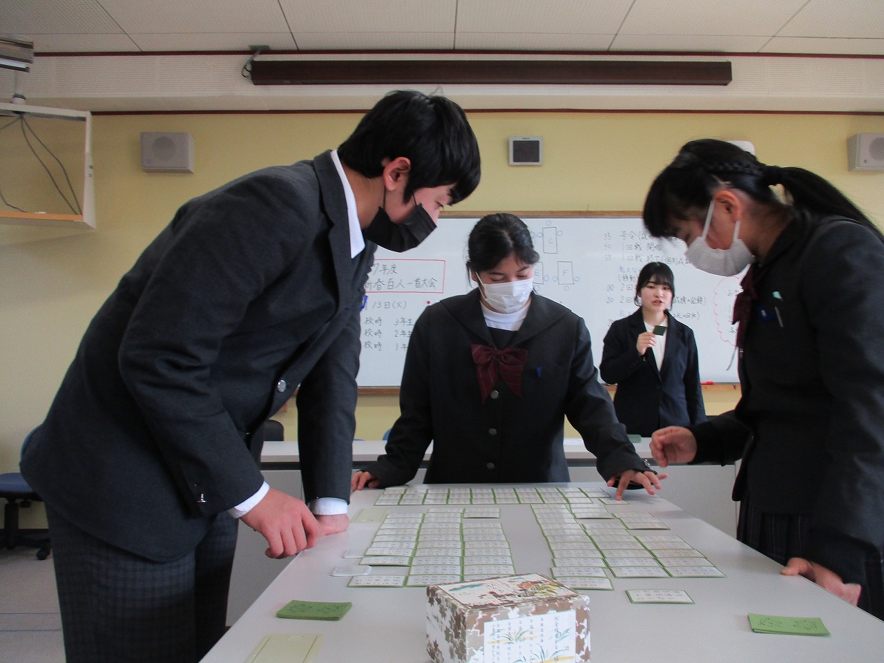 新年最初の行事として、国語科の授業にて、学年別百人一首大会が開催されました。グループで対決した後、成績に応じて次のステージへと進む仕組みになっており、ステージが上がるにつれて、白熱した試合へと展開していきました。日本の伝統文化である百人一首の体験を通じて、楽しみながら級友との親睦を深める貴重な機会となりました。