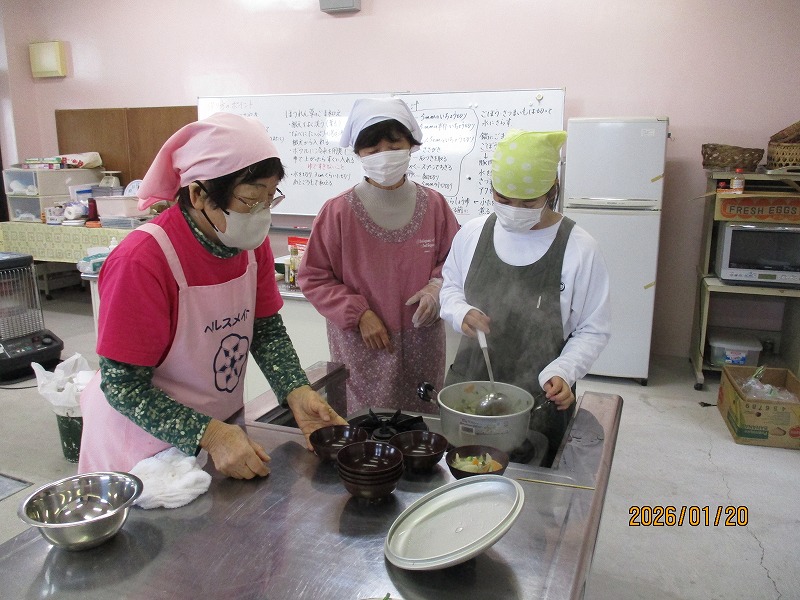 12月16日(火)、2年生の家庭科で調理実習をしました。メニューは郷土料理でけんちょうとチシャなますとつみれ汁でした。今回は、地域の食生活改善推進委員(食推さん)の方がご指導に来てくださり、調理の仕方や地域に伝わる食の知恵を直接伺うことができ、非常に有意義な時間となりました。食のプロである皆様との交流を通じて、食への関心がより一層深まったようです。ご指導ありがとうございました。