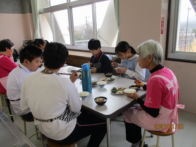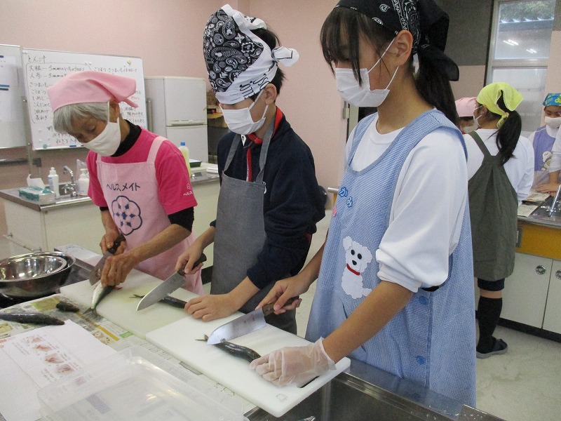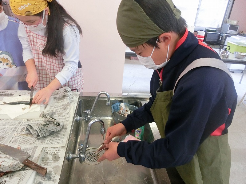 1年生は二度目の調理実習でした。今回は「いわしの蒲焼き、ほうれん草のごま和え、豚汁」に挑戦しました。二年生と同様に、地域の食生活改善推進委員(食推さん)の方がご指導に来てくださり、いわしの裁き方など丁寧に教えてくださいました。おかげで難しい調理内容でしたが、手際よくでき、子どもたちも達成感を感じていました。ご指導ありがとうございました。